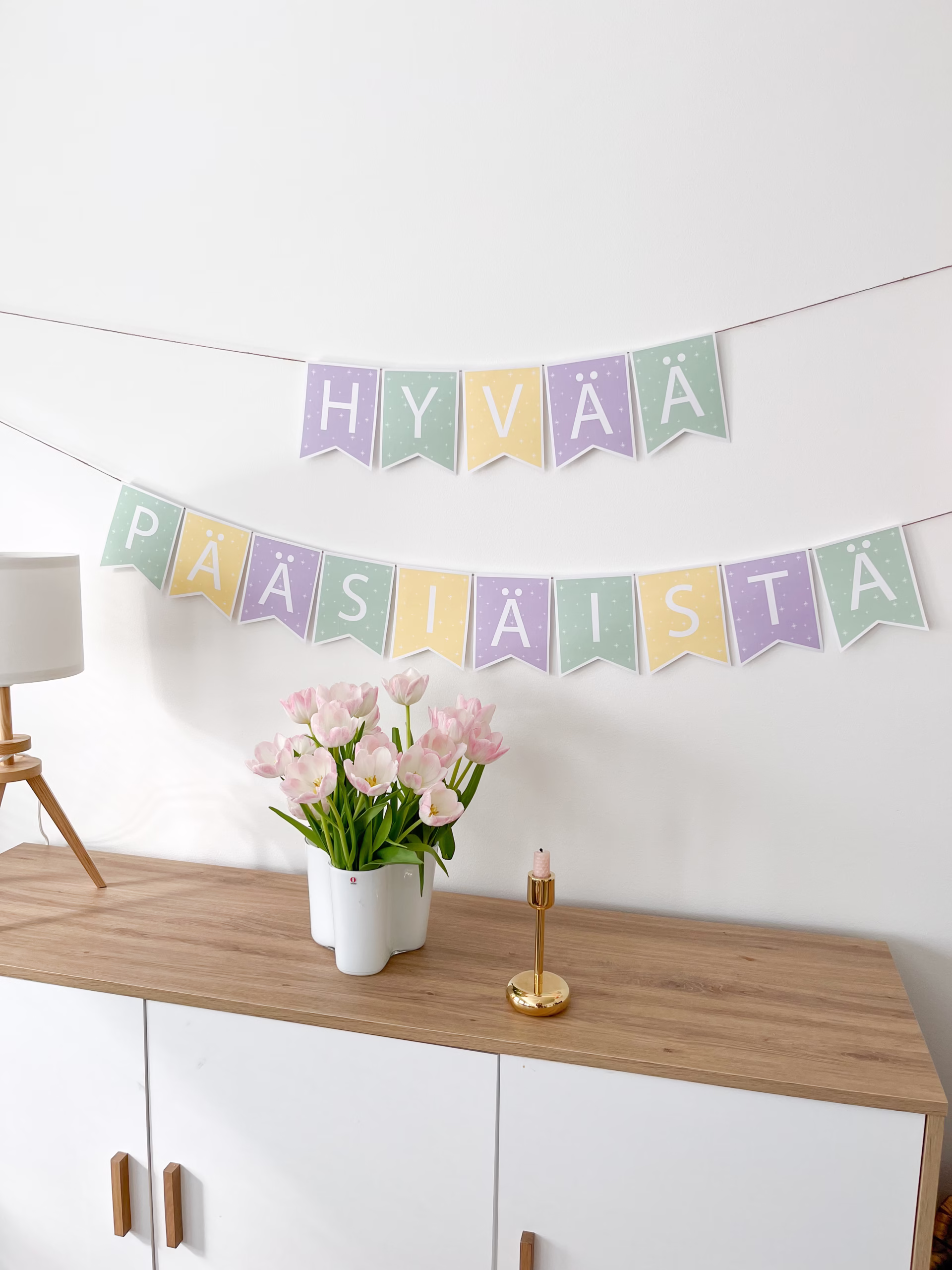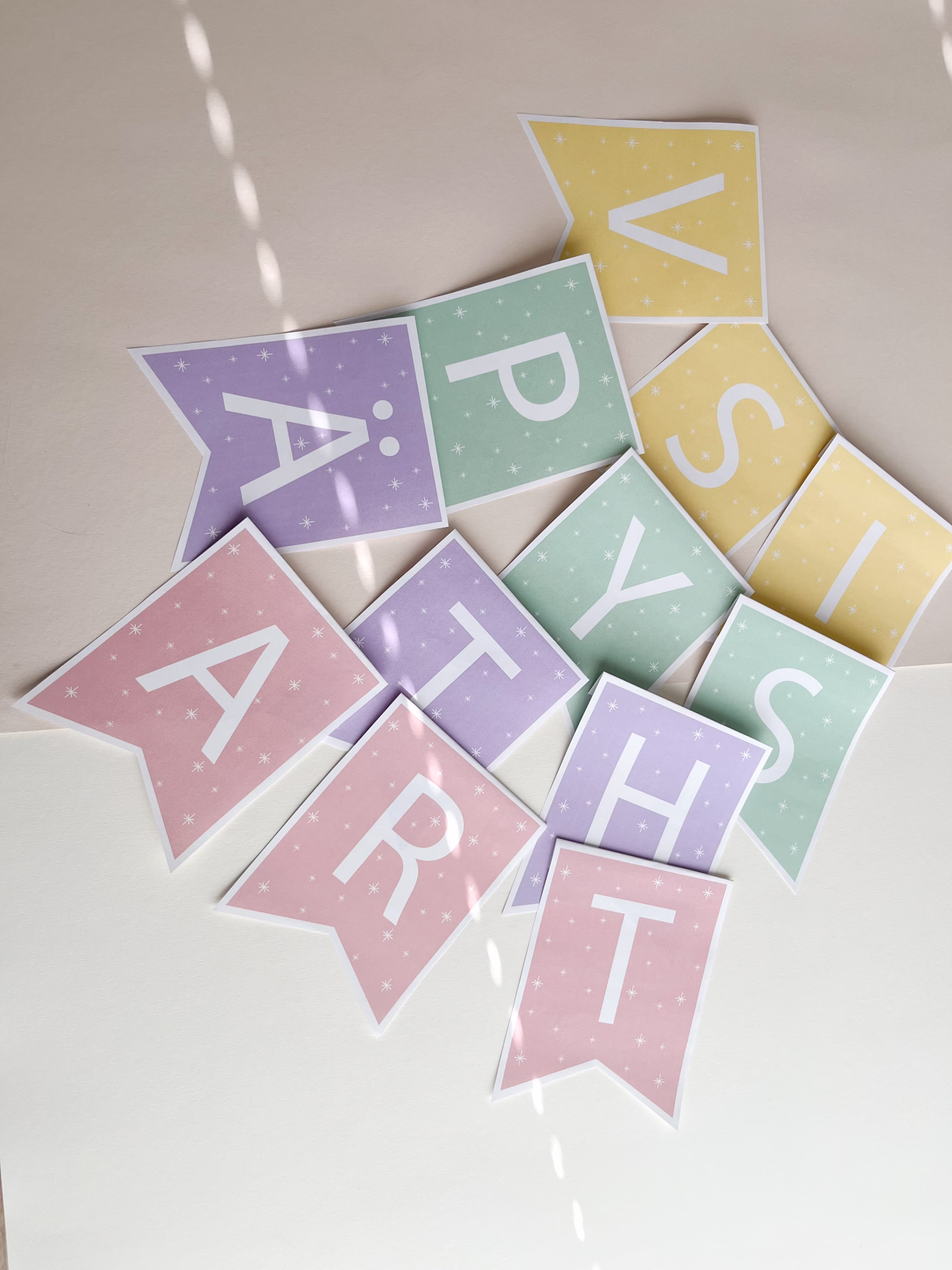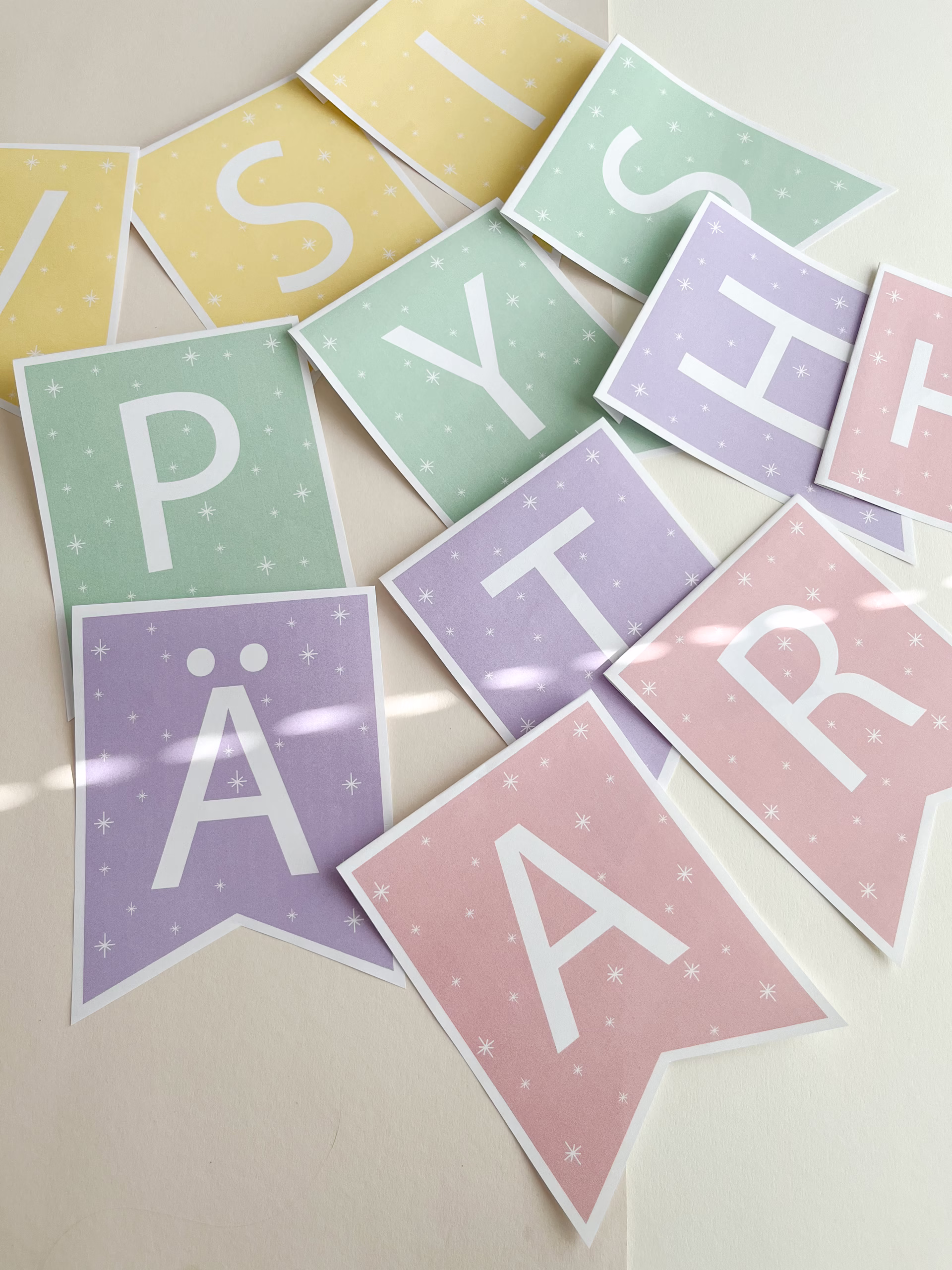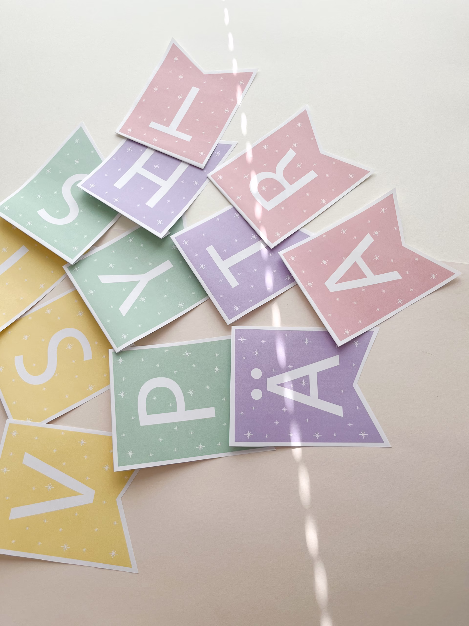 Luo helposti näyttävä tulostettava aakkosviiri juhliin tai lastenhuoneeseen. Näiden pastellin sävyisten viirien avulla voit kirjoittaa minkä tahansa nimen, sanan tai juhlatekstin monivärisesti – esimerkiksi syntymäpäiväonnittelun, tervetulotoivotuksen tai lapsen nimen.